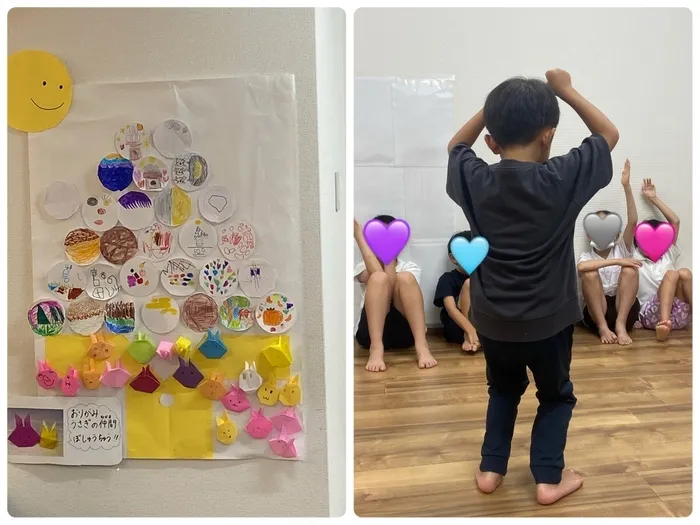 お団子に模様を書いたり、折り紙でうさぎさんを折ったり、今回はみんなで1つの大きな作品を作っています。今日のお友達がお団子を作成したら完成です✨