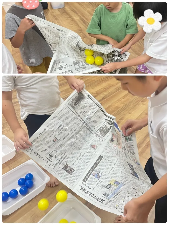 2人のときは、広げた新聞紙を2人で持ち、そこにボールを2つ乗せて運びました!協力プレイとなるともっと難しいo(゚д゚o≡o゚д゚)o