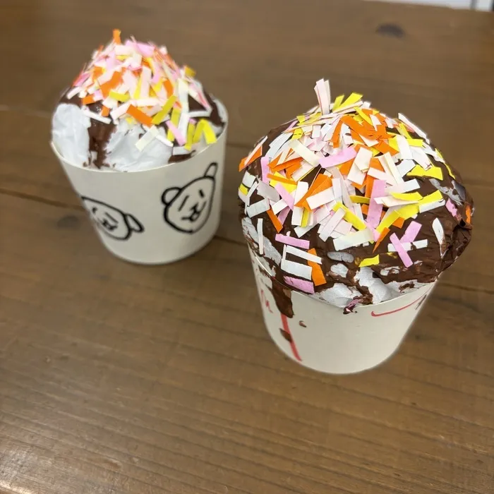 アイス組は、フラワー紙を使ってアイスの形を作り、絵の具を垂らしてチョコをトッピング🍫更にその上にカラースプレーを掛けて可愛く仕上がりました˚*カップには個性溢れる絵が描かれていますよ(o´罒`o)♥