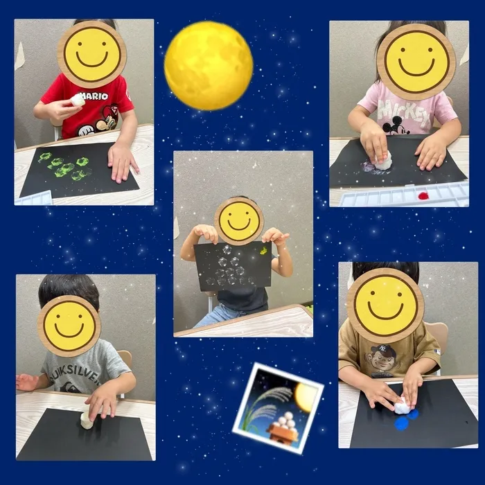 お友達に、好きな色を1つ選んでもらい、その後黄色の絵の具でお月様をスタンプしてもらっています🌙