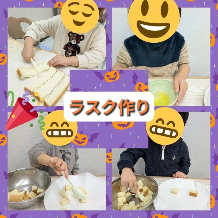 おやつの時間には皆で「いただきます!」と手を合わせて、作ったラスクを食べました。「先生!おいしー!」と伝えてくれるお友達もいましたよ🎶