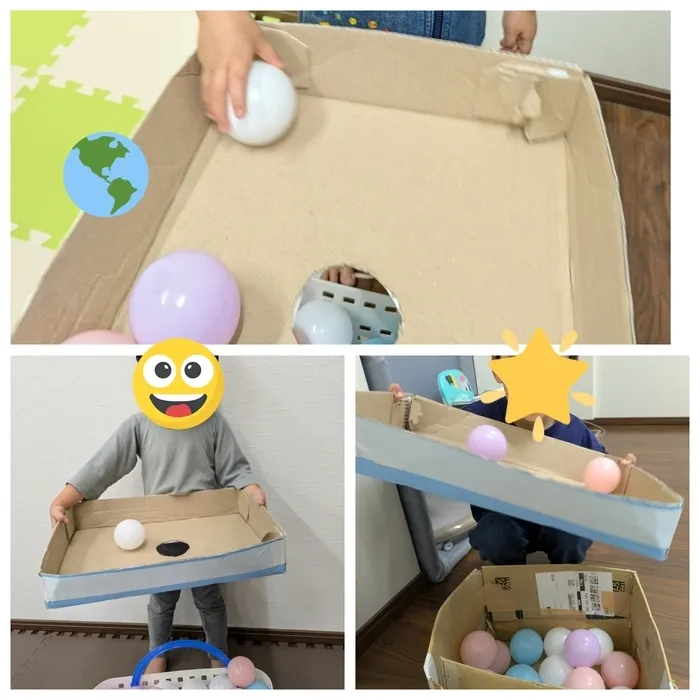 中々真ん中の穴に入れるには、力強くすると入りにくく、意外と難しい…💦一緒にゆっくりダンボールを動かしながら、穴にボールを入れてハイタッチ🙏