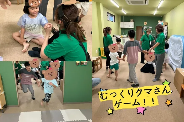 こんにちは♡ 児童発達支援・放課後等デイサービス どんぐりです✨今日はむっくりくまさんを行いました。みんなで手を繋ぎくまさんの周りを回ります。くまさんを起こすと声を出しながら逃げ出すお友達。くまさんのお友達は必死にお友達を捕まえていましたよ😆