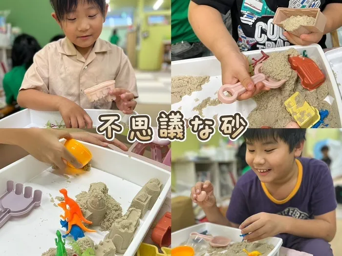 こんにちは♡ 児童発達支援・放課後等デイサービス どんぐりです✨今日は不思議な砂で遊びました。お部屋で遊べる砂遊び!?ふわふわの感触で「気持ちいい〜」と言いながら触っていました。恐竜の世界を作ってみたり、お城を作ってみたりして遊んでいました。
