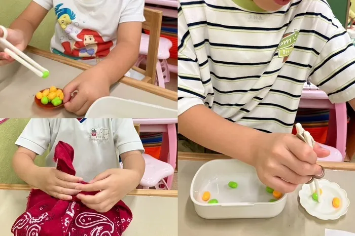 こんにちは♡ 児童発達支援・放課後等デイサービス どんぐりです✨今週はお箸の練習やスプーンの練習をする週です。プログラムの他に個別で療育を行うこともあります。お箸で豆を掴む練習。わざとスタッフがお皿を揺らしてなかなか取れないようにしたりすると子どもたちはキャッキャ言いながら楽しく学んでいました。