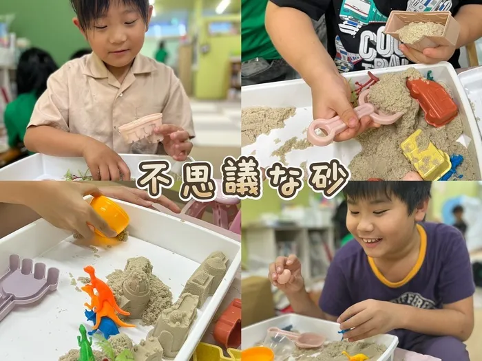 こんにちは♡ 児童発達支援・放課後等デイサービス どんぐりです✨今日は不思議な砂で遊びました。お部屋で遊べる砂遊び!?ふわふわの感触で「気持ちいい〜」と言いながら触っていました。恐竜の世界を作ってみたり、お城を作ってみたりして遊んでいました。