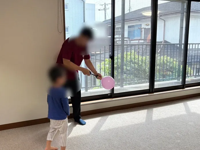 特に盛り上がったのは、風船に空気入れで空気を入れてから放す遊びです。勢いよく飛んでいく風船に「わぁ!」と歓声があがり、どこへ行くか分からない動きを一生懸命目で追いかける姿がとても楽しそうでした。