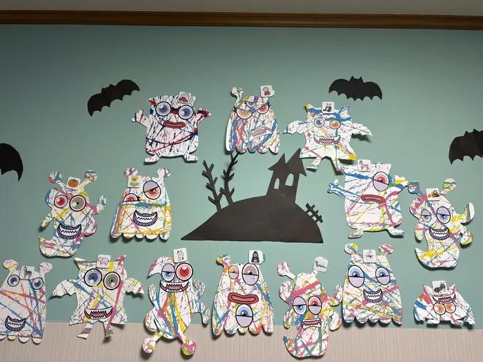完成した作品から順に玄関に飾っているのですが、子どもたち一人ひとりが思い描いたモンスターが並び、とてもにぎやかな雰囲気になっています。
