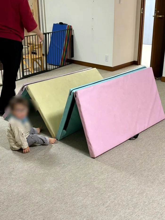 たとえば、お山のようにマットを重ねて登り降りの遊びに変身!足を高く上げて登ったり、バランスを取りながら下りたりと、全身を使って挑戦しています。子どもたちは「もう一回!」と何度も繰り返し、笑顔いっぱいで取り組んでいます。