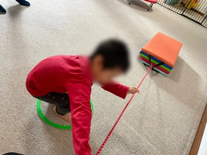大きいお友達は、レベルアップした課題にも挑戦しました。マットの上にボールを乗せて、落とさないようにそーっと引っ張るミッションです。これは、目で見ながら手を動かす 協応動作(目と手の連動) の力を育てます。落ちそうになって「あっ!」と声が出たり、うまくいくと嬉しそうな笑顔を見せてくれたり、それぞれのペースで一生懸命取り組む姿がとても素敵でした。