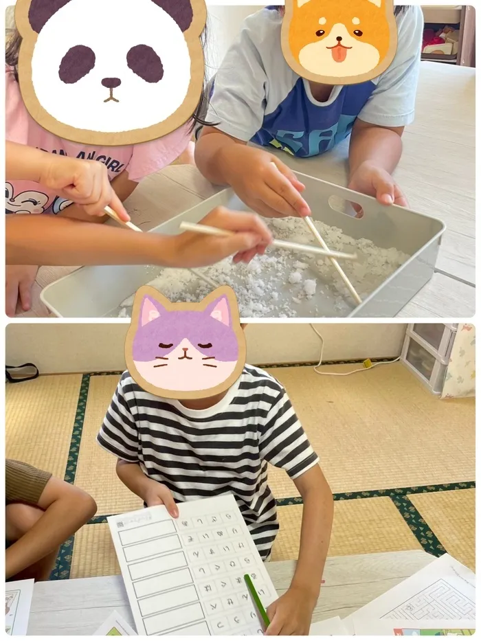 本日のわくわくは、児童発達支援のお友達と放課後ディサービスのお友達と一緒に一日楽しく活動しています。午前中は、わくわくプリントの脳トレをしました📖。間違い探しや、なぞり書き、迷路など自分で選んでしっかり課題をこなし頑張りましたがんばりました💪お名前をなぞってかけるようになったり難しい問題を自分から選んだ子もいました。又、午後は外のキッズパークで汗💦を流し室内でふわふわ雪☃️作りを行いました。色🩷をつけたりハート❤️や恐竜🦕の形を作って楽しみました😊