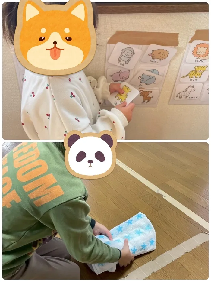 本日は、秋🍂のお天気に恵まれ室内活動と室外活動も出来ました🙌室内では、幼稚園児は日々療育の中で行っている動物🐱カルタを全員で行っています。壁に動物😺の絵が貼ってありみんなカードを拾ってパッチンくっつけて正解⭕️しました。