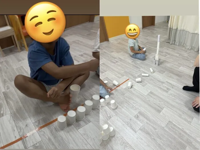 紙コップやトイレットペーパーの芯を積み上げる動作は、指先の力のトレーニングや「見る力」を養うことができます。