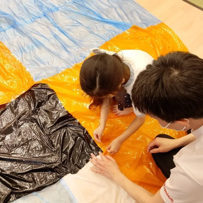 ・ビニール袋をテープでつなぎ合わせることで、手先の巧緻性を養う