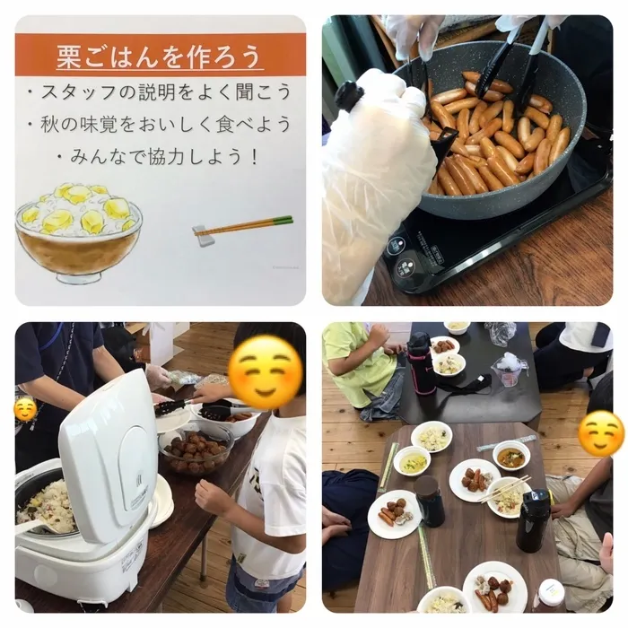 今日は、秋の味覚の栗とさつまいもを使って、栗とさつまいのごはんを作りました🌰🍠ご飯にはみりん等の調味料を計量して入れたり、ウインナーを炒めたり、オーロラソースを作ったりとみんなで分担して作りました😆👏🏻栗ご飯を初めて食べる児童もいましたが、自分達で作った事もあり「美味しい〜」と言って、たくさんおかわりして食べました😋💖