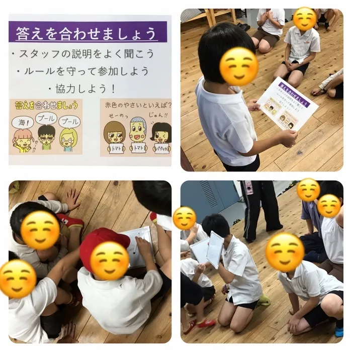 今日は、答えを合わせましょうゲームをしました🗣🤝🏻学年が近い児童4人のチームになり、お題にまつわるヒントを聞いてチーム内で相談して答えを1つに絞って代表の人が発表しました🙋🏻🙋🏻♀️全チームの答えが同じになり正解した時は、みんなとても喜ぶ姿がありました🤩👏🏻
