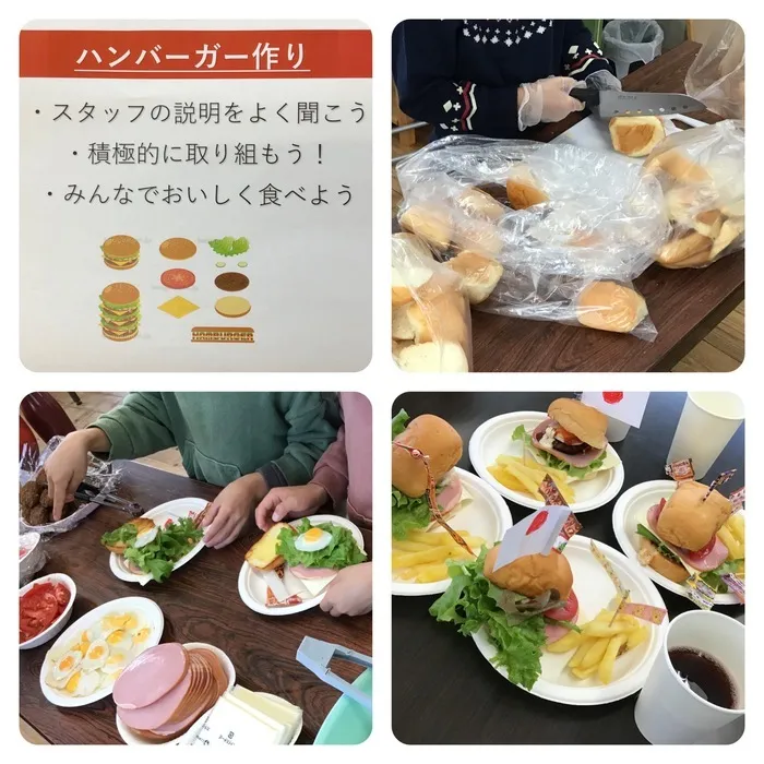 今日は、ハンバーガー作りをしました🍔レタスやトマト、ハンバーグなどの具材の準備はみんなで分担して行い、スムーズに準備する事ご出来ました😆👏🏻準備が出来たら、ハンバーガーにさす手作りの旗も作りました🎌