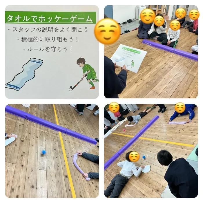 今日は、タオルでホッケーゲームをしました😊✨4チームに分かれて、チーム対抗でうつ伏せで寝転がった姿勢のままタオルを持ち、転がってくるボールを相手チームへ跳ね返して先に5点先取した方が勝ちというルールでした😆🤲🏻みんな先に5点取るために、試合の時は一生懸命取り組み、1点取るごとにチーム全員で喜び、大盛り上がりでした🤩👏🏻