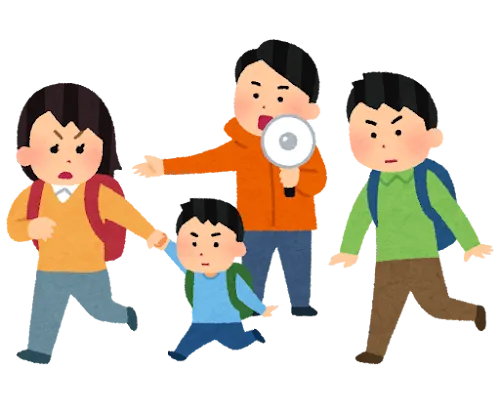 火災が起きた場合には手を口に当てて靴を履いて逃げること。