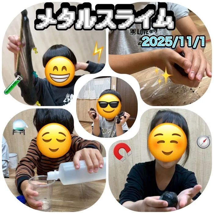 まるで生き物のように磁石に向かっていくのを見たり、小さな磁石をたくさん付けたり…独特なスライムをみんなで楽しみました!