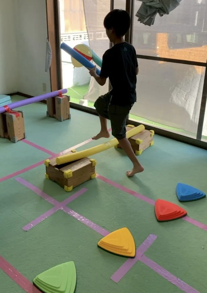 夏休みから運動を取り入れた集団活動を取り入れています。バランスストーンなどの障害物を置いてその上を歩いたり、楽しみながら体の動きの向上を目指します。今後も皆が笑顔で参加できるよう工夫していきたいと思います。