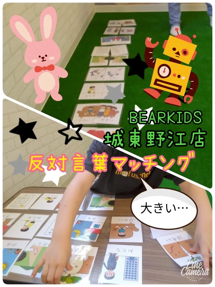 反対言葉のカード遊びを行いました。はじめは少し難しそうな表情も見られましたが、1〜2枚進めるうちに「あ!これ!」とカードを見つけ、自信を持って取り組む姿が見られました。クルーと一緒に反対言葉を読みながら楽しく進め、「○○はこんなにできたよー!」と笑顔で教えてくれました😊