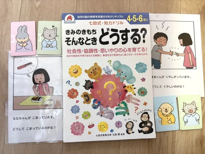 あていんでは写真のような教材を使い、「こんな時どんな気持ち?」「こんな時どうする?」「こんな時なんていう?」「どうしてかな?」などの教材に日々取り組んでいます🌼
