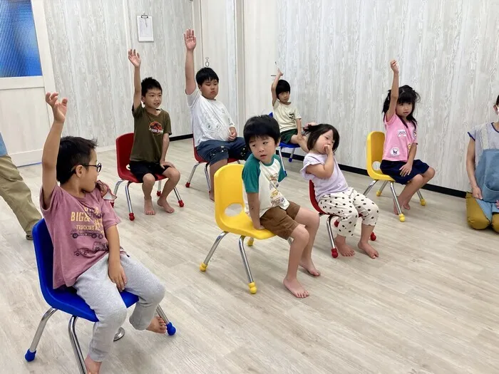 本日は、うたの活動の様子です。お写真は、放課後等デイサービスの発表の様子です。きれいにピンっと手が挙がっているのが素敵ですね✨