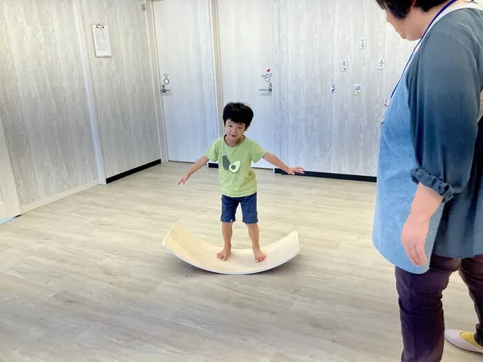 写真は、バランスボードで、写真のような使い方の他にも、ひっくり返して橋のようにしたり、写真の状態で小さいお子さまなら寝転がってゆらゆらすることも可能です。写真のように体をキープしたり、左右に揺れて体幹を鍛えたりすることもできます。その他にも、持ち手の付いた小さいバランスボードでぴょんぴょん跳ねて遊んだり、お子さまたちは、楽しみながら毎日体を動かしています!