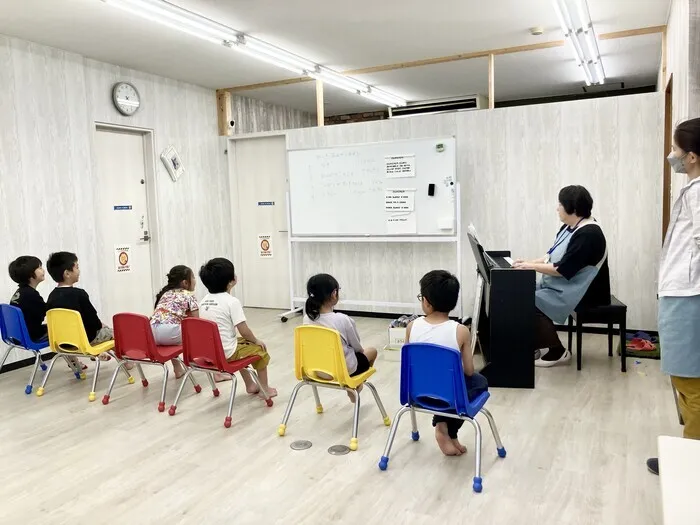 その後、椅子取りゲームの要領でピアノの速さに合わせてみんなで移動して、音が止まったら近くの空いている椅子に座ります。当然担当の音も変わってきます!
