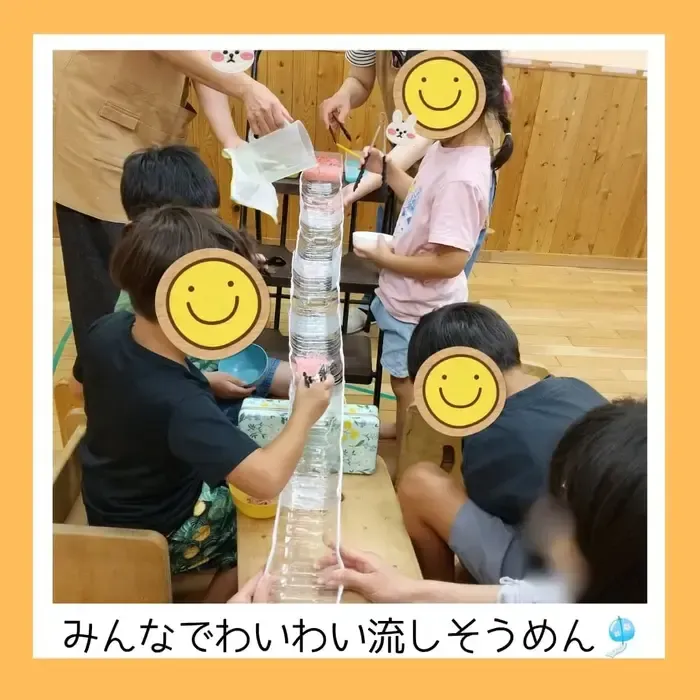 支援者がペットボトルで手作りした装置から、カラフルなそうめんが流れてきます🎐