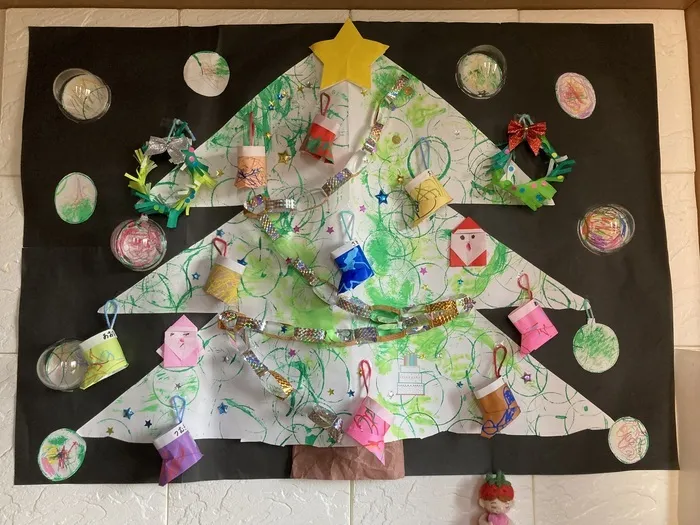 折り紙で年長組さんがサンタさんを折ってくれたり、クリスマスブーツの柄をペンで描いたりして装飾しました。