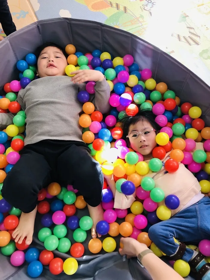 ボールプールに一緒に入る二人のお友だち。