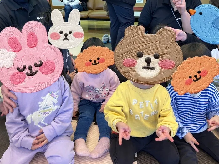 お話し会では季節の手遊び歌や大型絵本などメリーの子どもたちは興味津々でした💕