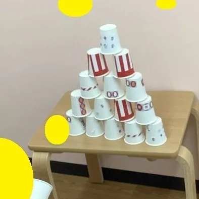 紙コップを台に並べたり、ピラミッド状に積み上げて的を作ります。