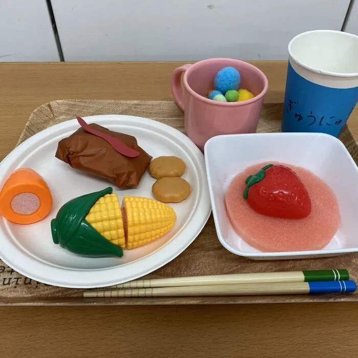給食の献立は、おままごとやふわふわボールなどを食べ物に見立てて作りました。