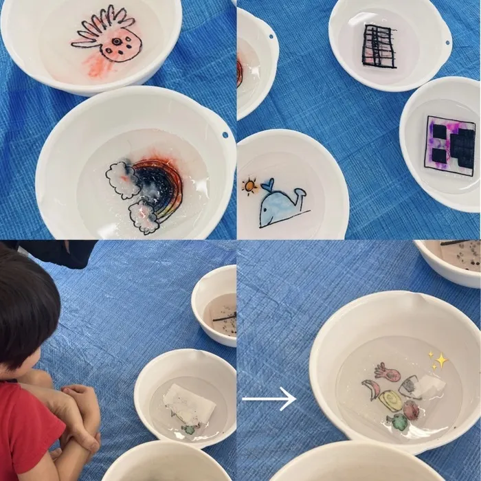 今回はキッチンペーパーに描いた絵を水に浮かべるにじみ絵アートを行いました!