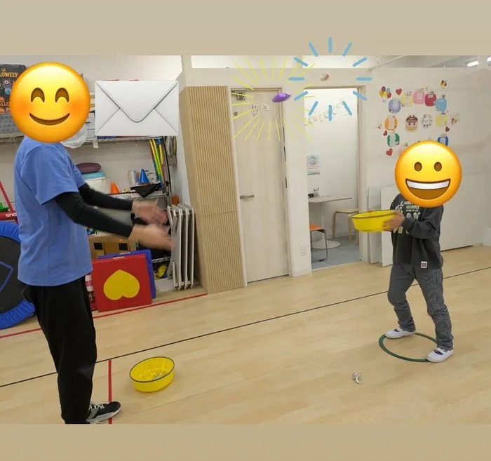 この運動では、動いているものを目で追ってカゴでキャッチするため追視の運動になります👀