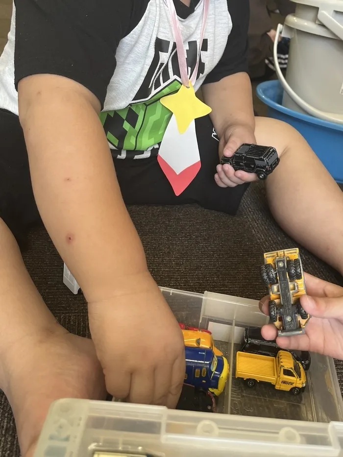 お掃除ヒーローネクタイをつけて、いつも使っている玩具やお部屋をお掃除しました!