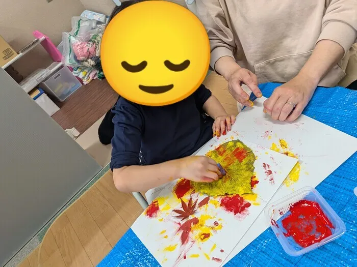 千切れやすいので落ち葉に優しく絵の具を塗りながら、画用紙にペタン♬