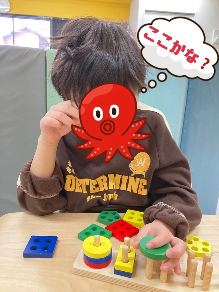 子どもたちは 穴の開いた積み木(リング)を、どの棒に入れるとピッタリか を考えながら差し込んでいきます🌟