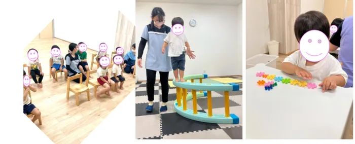 センサリーマット・マットの上で転がる・太鼓橋を行っています。センサリーマットでは、苦手な感触はなく楽しみながら、毛糸やチクチクの物を踏んでいました!マットの上でも手足を伸ばせるように、まずは援助をし1度転がると、2回目からは自分で転がることが出来ていましたよ💕太鼓橋は以前行った動作を覚えており今回は1人で登ることが出来ました✨5名ほどで、順番を守ることも出来ています🍀