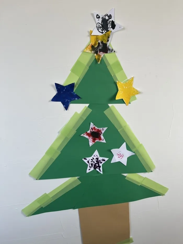 星や靴など絵の具を使って色を付けた物でツリーを飾り付け♬