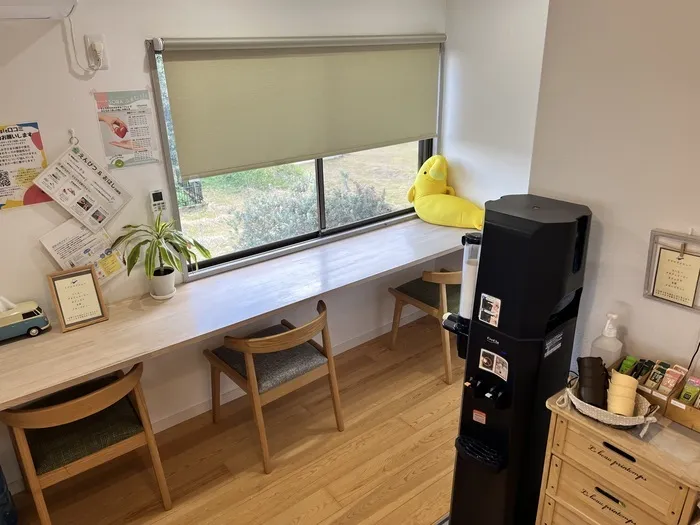 子どもたちの支援の待ち時間に、保護者の方がここに座って飲み物を飲んだりおしゃべりしたりしてすごすスペースです🌿