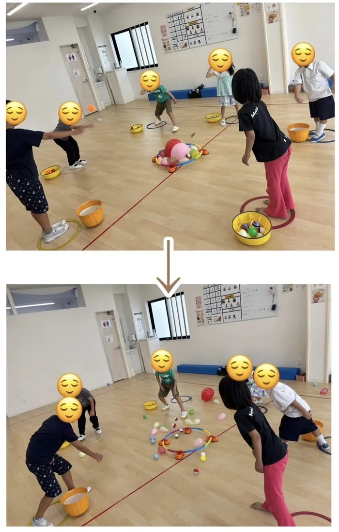 フラフープの中に小さな風船をたくさん入れ、子どもたちは自分の輪っかの中からボールを投げて風船に当てます。