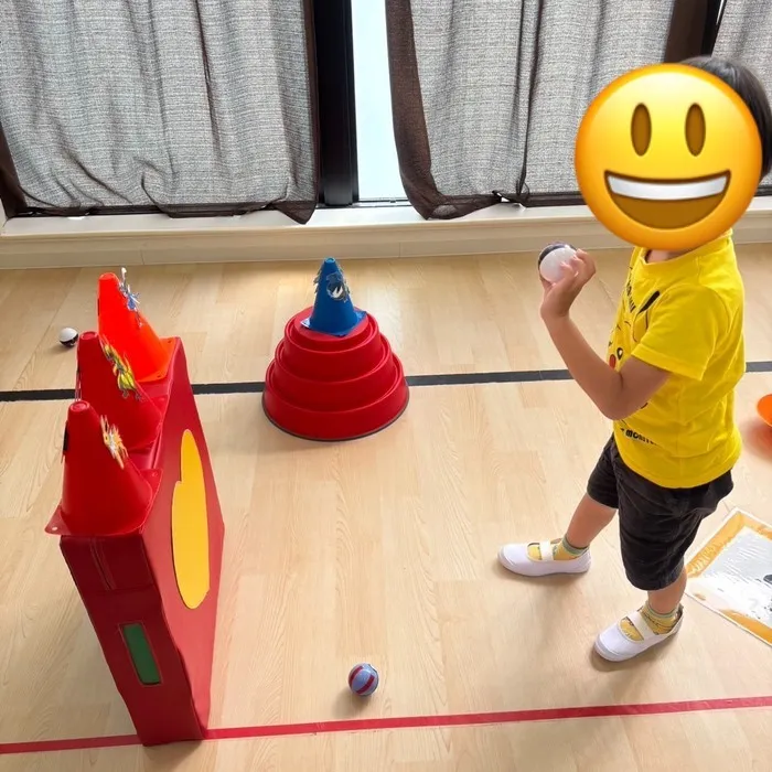「どこ狙おうかな?」「次はもっと当てたい!」と自然に意欲が高まり、順番を待つ・応援するなどの社会性も一緒に身につけられるのがポイント。新聞紙ボールやペットボトル的など、身近な材料でアレンジできるのも魅力です。
