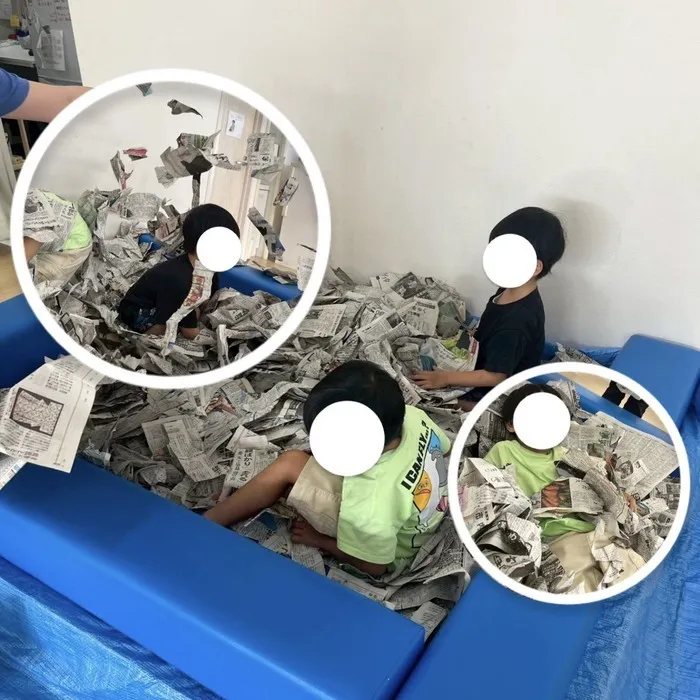 新聞紙を破ることで指先の感覚刺激になり、全身であそぶことで感触あそびや感情の解放にもつながります。