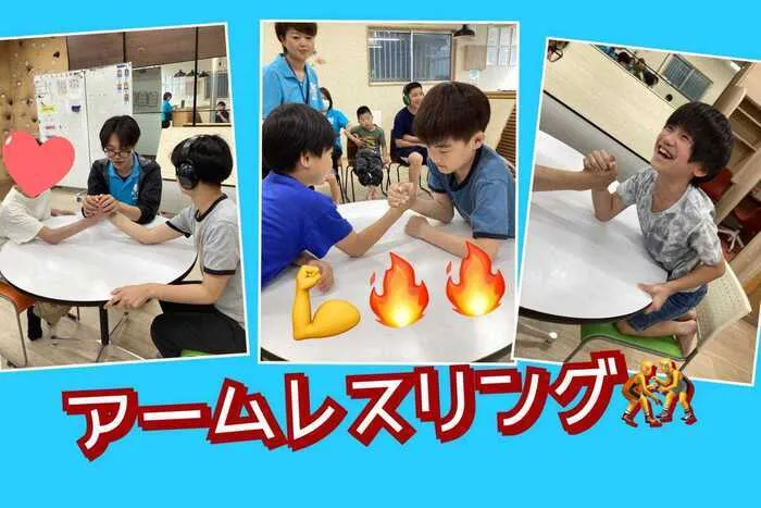 「どこに力を入れるの?」「この角度で合ってるかな?」と声を掛け合いながら、コツをつかもうと一生懸命。簡単そうに見える腕相撲も、実は全身を使う運動だということに気づき、びっくりする子もいました。