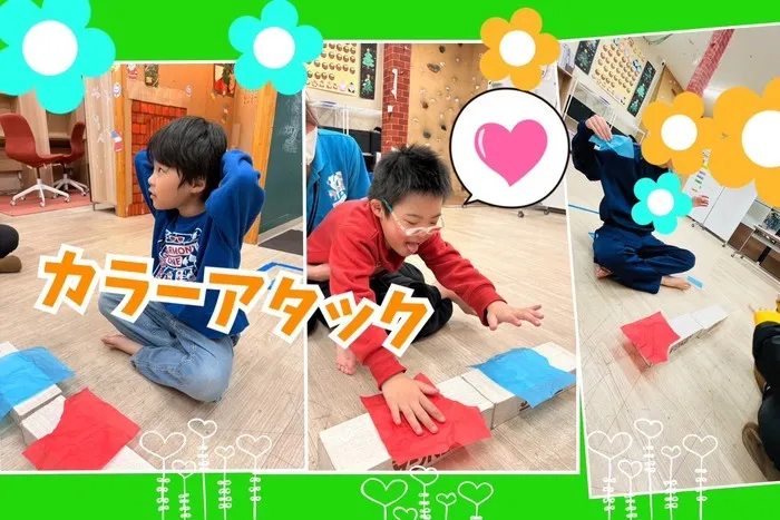 最初は座って行うゲームからスタートしました。2人で向かい合って座り、赤と青の色紙を前に置きます。審判が赤と青の板を落とし、出た色と同じ色紙を素早く引っ張ります。間違った色を引いたり、引けなかったりすると負けになるため、みんな真剣な表情で取り組んでいました。5回戦行いました。