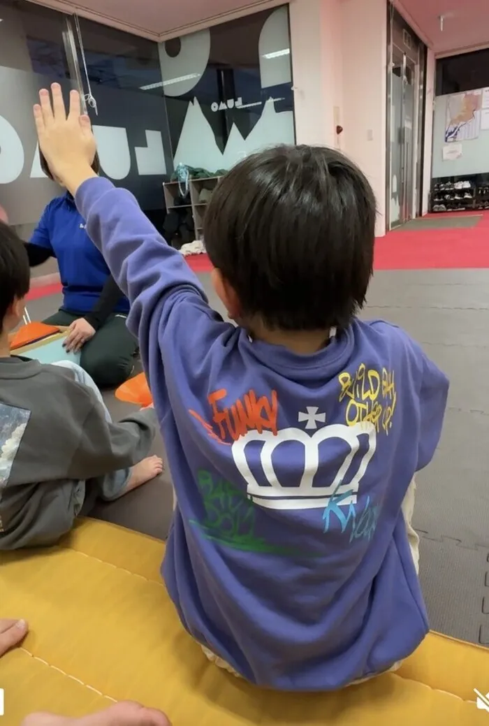 個人でボールキャッチのメニューに取り組んだ後、みんなの前で発表できる児童はチャレンジしてみましょう!という場面で、以前までは恥ずかしい気持ちと失敗する事が嫌な気持ちが交差しなかなか発表できなかった児童がこんなに背筋を伸ばしピンっと手を挙げていることに驚きました!😮👏🏻